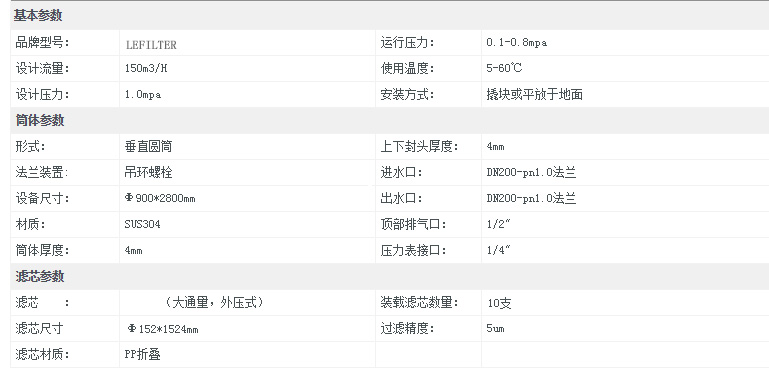 利菲爾特大流量保安過濾器結構為圓柱形殼體,材質為304或,316L不銹鋼;配以單支或多支濾芯。