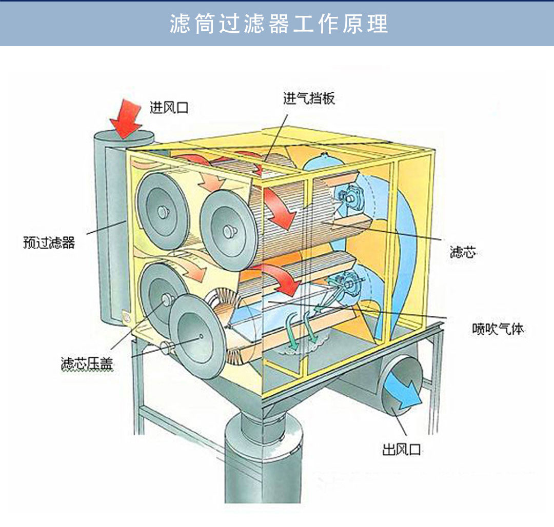 在此過程中必須定期對濾筒進行更換和清洗,以確保過濾效果和精度,因為在過濾過程中粉塵除了被阻隔外還有部分會沉積于濾料表面,增大阻力,所以一般的正確更換時間是三至五個月。