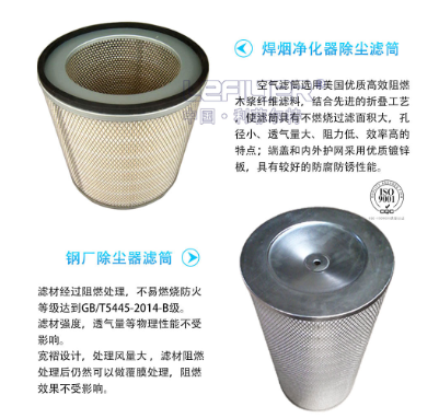 大型空壓機入口除塵濾筒是空氣過濾器的核心。在工業上未經過濾的自然空氣進入空壓機及空調送風系統,鋼鐵業高爐引風機、燃氣輪機、柴油機、制氧原料空壓機、因空氣中含大量塵埃,在長時間的高速氣流運行中粉塵是天敵,粉塵造成以上設備的葉片、葉輪等內部部件的磨損、腐蝕和結垢,縮短設備使用壽命,影響生產造成經濟損失,焊接煙氣除塵濾芯在過濾器中的重要地位,當空氣穿過自潔式空氣過濾筒時,粉塵由于重力、靜電、接觸被阻留在濾筒外表面,凈化空氣進入凈氣室然后由出風管送出。.空氣過濾器的核心是過濾筒,濾芯采用進口高效防水過濾紙,經特殊工藝生產而成。.過濾筒過濾效率高(比色法90%、重量法99.9%)精度(1um)99.9%,比一般提高5%-10%。