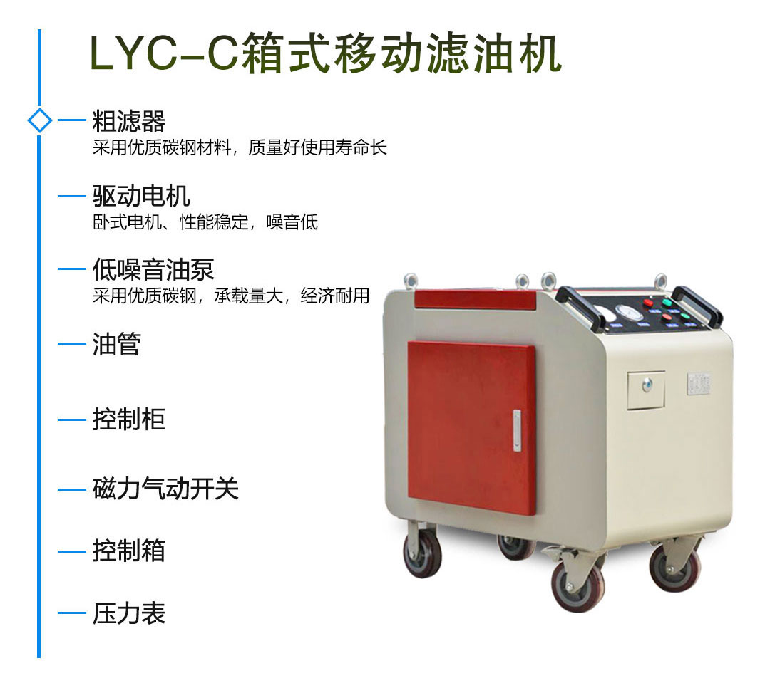 LYC-C系列箱式濾油機自帶油箱,可將自備郵箱中的經自循環過濾達到標準后直接注入系統,尤其適合伺服閥、比例溢流閥等精密元件的液壓系統。這種