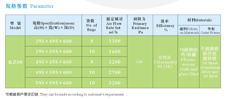 本公司采用的濾材為三層濾料均勻熱熔粘合。第一層粗纖維過濾棉捕捉空氣中較大的塵埃,較細的纖維濾紙捕捉空氣中較小的塵埃,較外層無紡布為強化保護層。合理的三層設計使產品具有優良的性能,牢固的熱熔技術避免了風壓產生的泄露,隔網避免了袋與袋之間的貼合,更加細化了送風區域,降低了阻力,并使容塵量達到了較大。