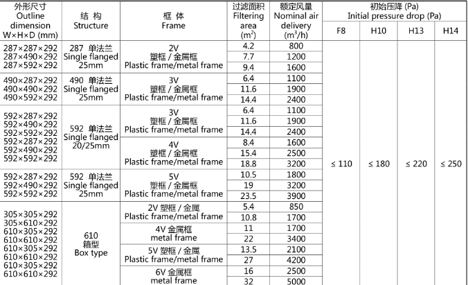 1、高風量型: 與普通高效過濾器相比,在相同的風量下可以使用更少的過濾器,降低成本減少安裝空間和節省安裝時間。