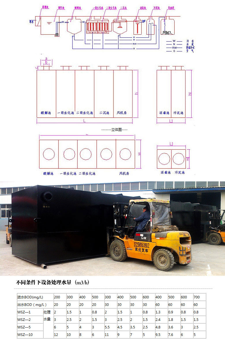 該設備采用國際先進的生物處理工藝,在總結國內外生活污水處理裝置的運行經驗基礎上,結合我公司自己的研究成果和工程實踐,設計出一種可地理設置的成套有機廢水處理裝置,集去除BOD5、COD、NH3于一身,具有技術性能穩定,處理效果好,投資省,自動化運行,維護操作方便等特點。