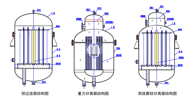 預(yù)過濾器罐體內(nèi)裝有納污容量大、使用壽命長(zhǎng)、過濾精度高的濾芯,污水進(jìn)入過濾器后,較粗的顆粒會(huì)因慣性沉淀下來(lái),較細(xì)的顆粒被濾芯表面攔截,較后凈水經(jīng)過出水管線流出過濾器。隨著過濾時(shí)間增加,沉積在濾芯上的污染物越來(lái)越多,過濾器進(jìn)出口壓差逐漸上升,當(dāng)上升到較在允許工作壓差時(shí)(0.15MPa),說(shuō)明濾芯已被堵塞,需要及時(shí)更換。另外, 由于預(yù)過濾器濾芯是用超細(xì)玻璃纖維濾紙制成,因其固有特性,使得預(yù)過濾芯同時(shí)又分擔(dān)一部分破乳的功能, 即將水包油進(jìn)行破乳切開, 然后輸送至重力分離器內(nèi)聚結(jié)上浮。預(yù)過濾器作為高效聚結(jié)分離器的保護(hù)性裝置,具有高的過濾精度,能夠過濾去除細(xì)小的懸浮物雜質(zhì)(>10μm), 防止以顆粒為核心而不能破乳除油,因此有效延長(zhǎng)后續(xù)設(shè)備中聚結(jié)濾芯和吸附濾芯的使用壽命,減少運(yùn)行維護(hù)成本。預(yù)過濾器殼體整體采用不銹鋼304制作,表面鏡面拋光,外觀美觀大方,結(jié)構(gòu)如下圖左所示。