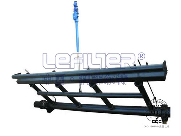 旋轉潷水器由潷水裝置、傳動裝置、撇渣浮筒裝置及回轉支承等組成。驅動機構通過可伸縮推桿帶動潷水裝置及撇渣浮筒裝置繞回轉支承旋轉,從而使潷水堰口上下移動,達到潷出上清液的目的。旋轉潷水器可根據工藝要求設計潷水深度。旋轉潷水器接到排水指令后快速將潷水堰口由停放位置移動到水面以下停止、排水;待清水排完后,旋轉潷水器又接到排水指令快速將潷水堰口由停放位置移動到水面以下停止,排水;如此反復。當旋轉潷水器到達較低水位后,安放在較低水位的液位開關發出返回指令,旋轉潷水器快速回升到較初的停放位置,完成一個工作循環。